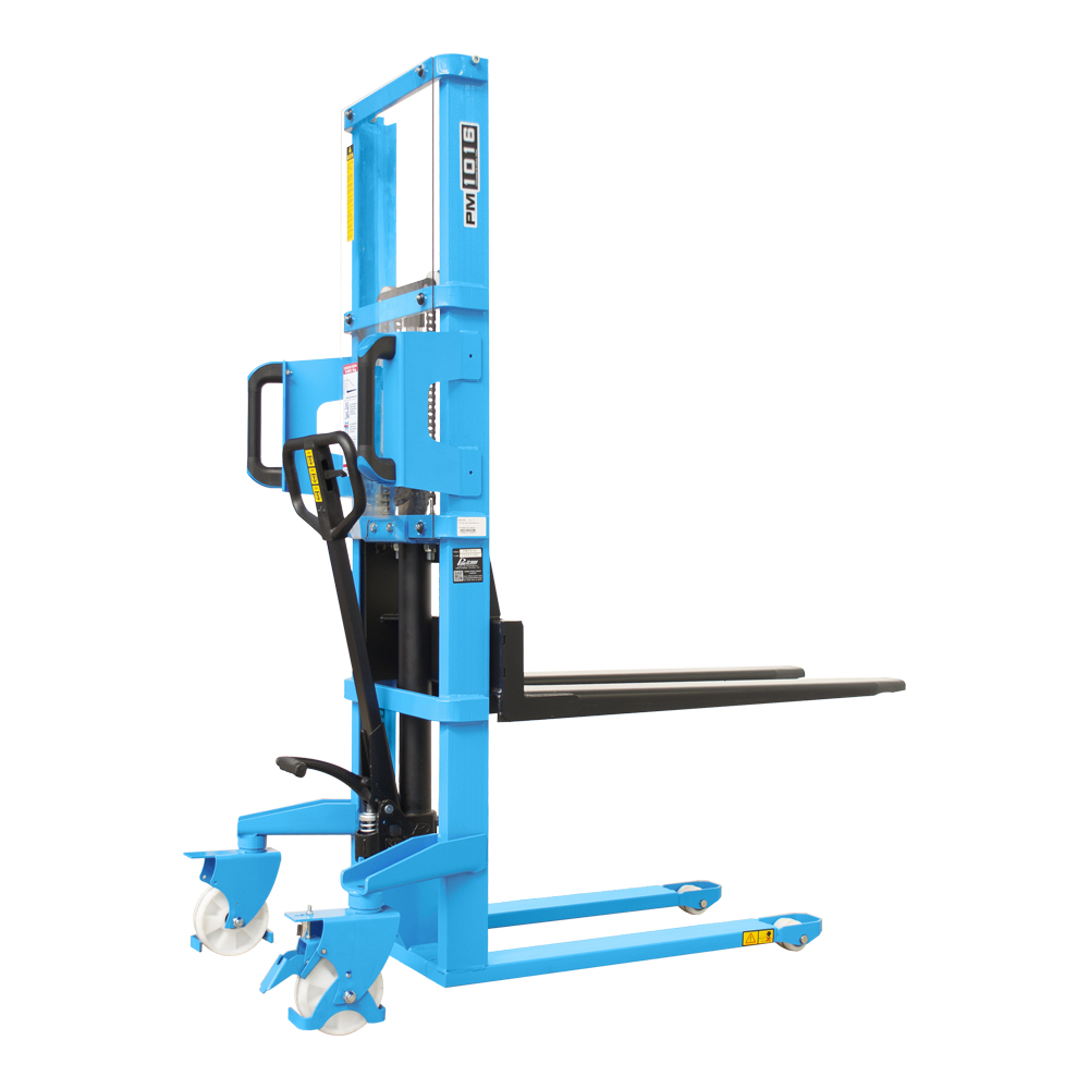 A empilhadeira manual PM1016 opera em paletes abertos, ideal para descargas leves. Elevação hidráulica por alavanca ou pedal, abaixamento manual. Manutenção simples, baixo custo, rodas de nylon, manobra fácil em corredores de 2,14 m. Operação segura, sem necessidade de certificação.
