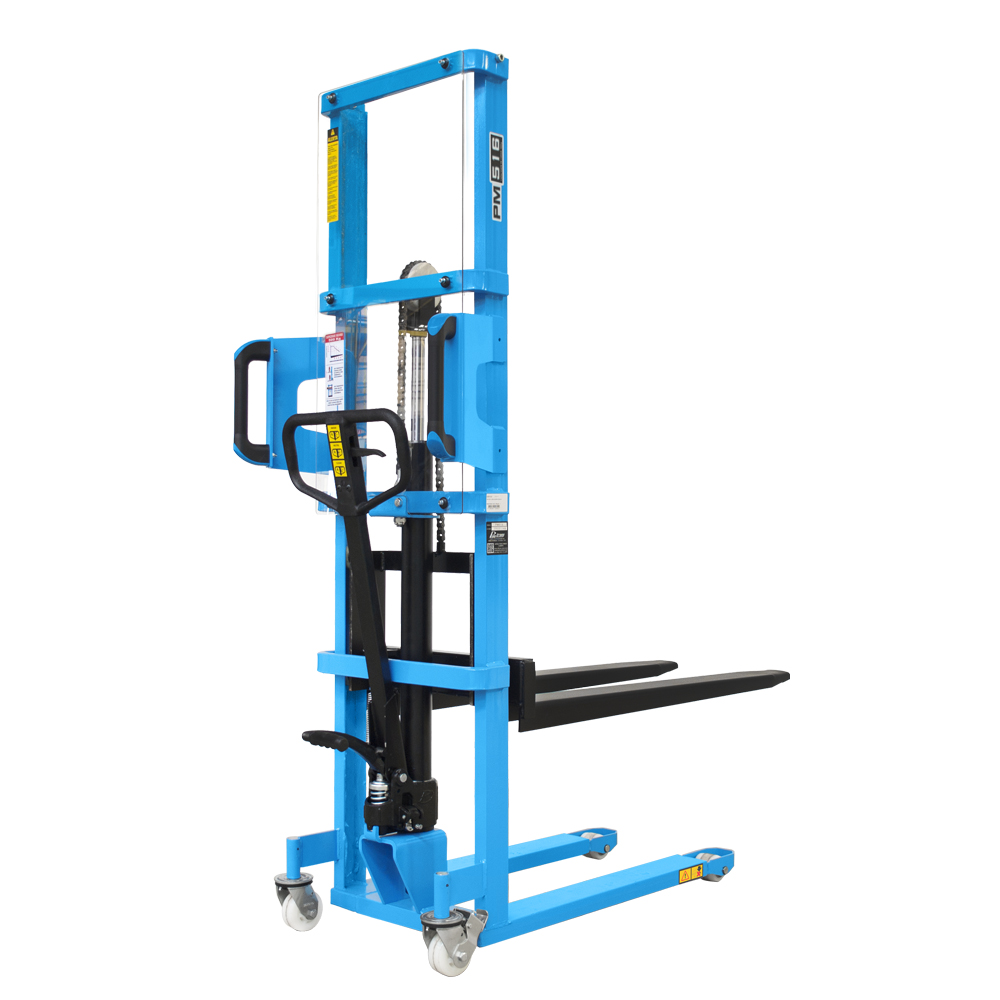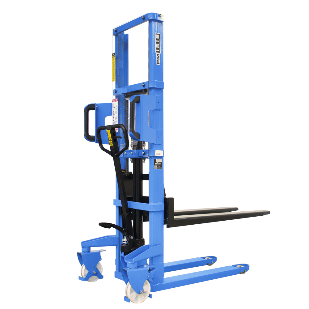 A empilhadeira manual PM1516 opera em paletes abertos, ideal para descargas leves. Elevação hidráulica por alavanca e abaixamento manual. Manutenção simples, baixo custo, rodas de nylon, manobra fácil em corredores de 2,14 m. Operação segura, sem necessidade de certificação.