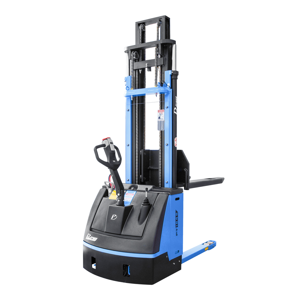 A empilhadeira elétrica patolada PT1645 tem tração e elevação elétricas, com opção de plataforma para operador. Ideal para paletes abertos, almoxarifados e cargas leves. Manutenção simples, rodas de poliuretano, manobra fácil em corredores de 2,28 m. Bateria tracionária.