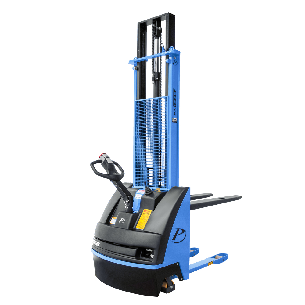 A empilhadeira elétrica PX1235 tem tração e elevação elétricas, operando em paletes abertos. Ideal para almoxarifados e cargas leves. Manutenção simples e baixo custo, manobra fácil em corredores de 2,1 m. Energia por bateria interna com carregador embutido.